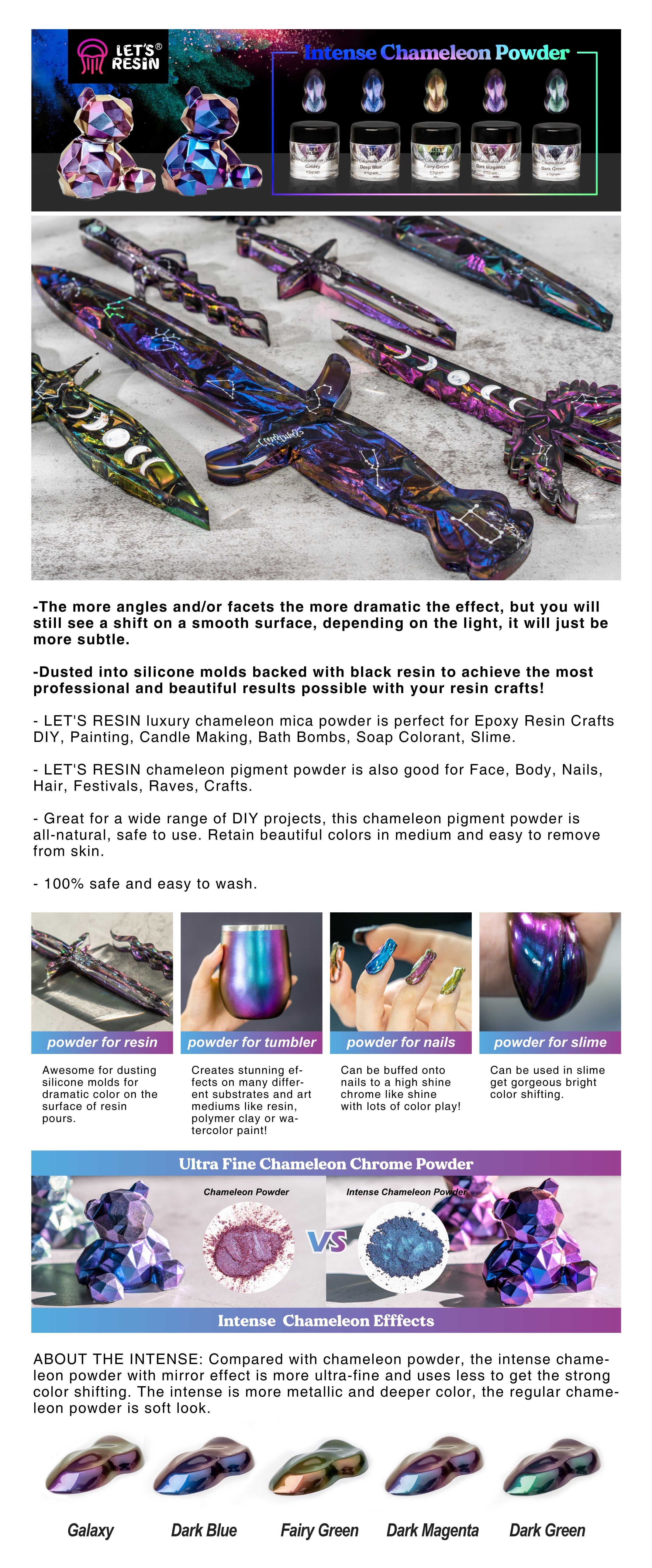 - *100% QUALITY ASSURANCE: LET'S RESIN Intense Chameleon Powder provides 30-days money-back. If epoxy resin color pigment pearl you received was damaged due to transportation, just contact us, we will provide a full refund or free exchange.