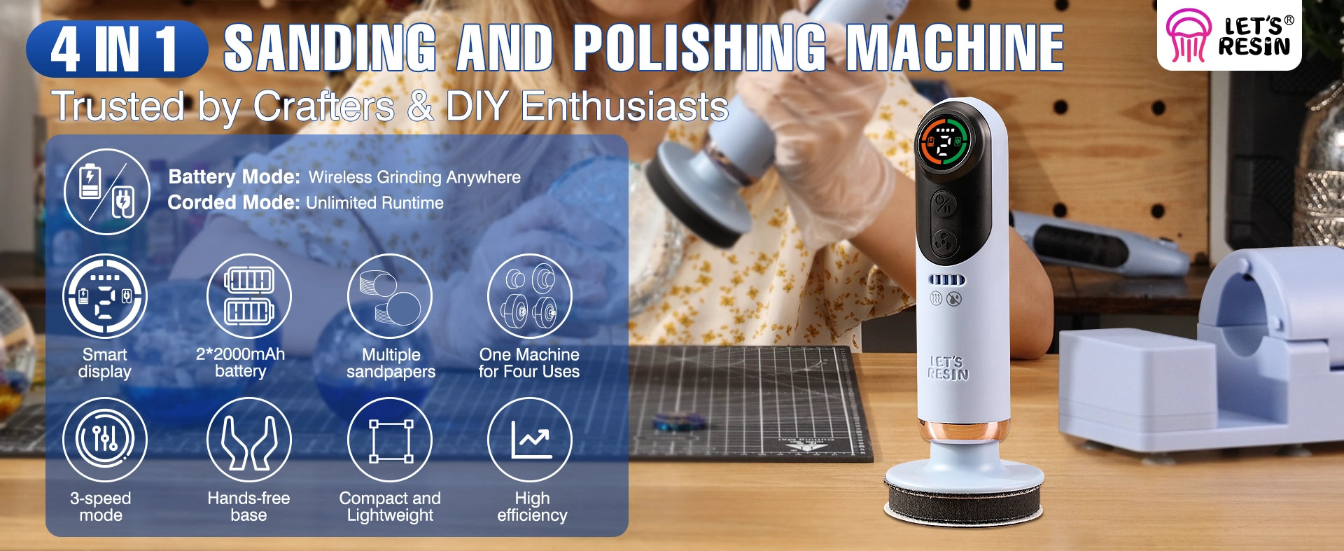 - 3-SPEED SETTINGS + LCD SCREEN: The resin grinding machine comes with 3 adjustable speeds, powered by a high-torque motor. Low speed for fine grinding, high speed for large-area sanding—ideal for different materials and tasks. The clear LCD screen displays speed, battery level, and power mode, keeping you in full control. Rigorously quality-tested, this electric resin sander and polisher is durable and reliable, with a marine blue finish adding style to your workspace.