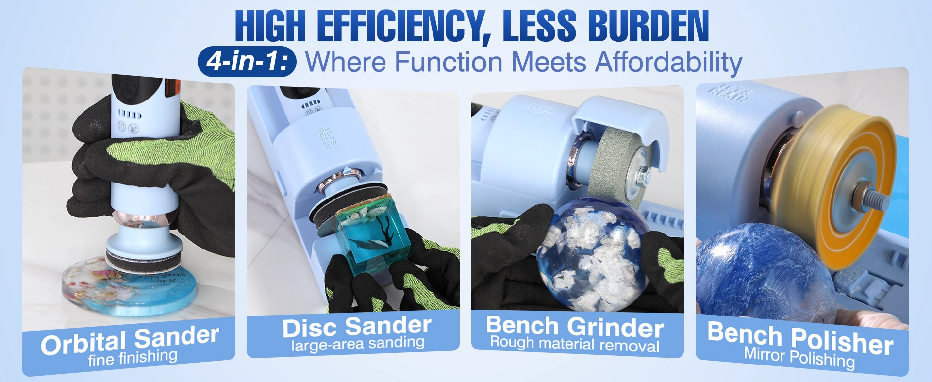 - POWERFUL 4-IN-1 RESIN POLISHING SOLUTION: One compact machine delivers the functions of a bench sander, bench polisher, tabletop grinder, and handheld sander. Save money, space, and effort—perfect for resin crafters seeking professional-level finishing results at home. It easily fixes small flaws like bubbles, burrs, scratches, excess resin on the injection ports, and uneven surfaces, ideal for resin shaping, sanding, and polishing. It also works on metal, glass, jade, jewelry, acrylic, ceramic, and wood.