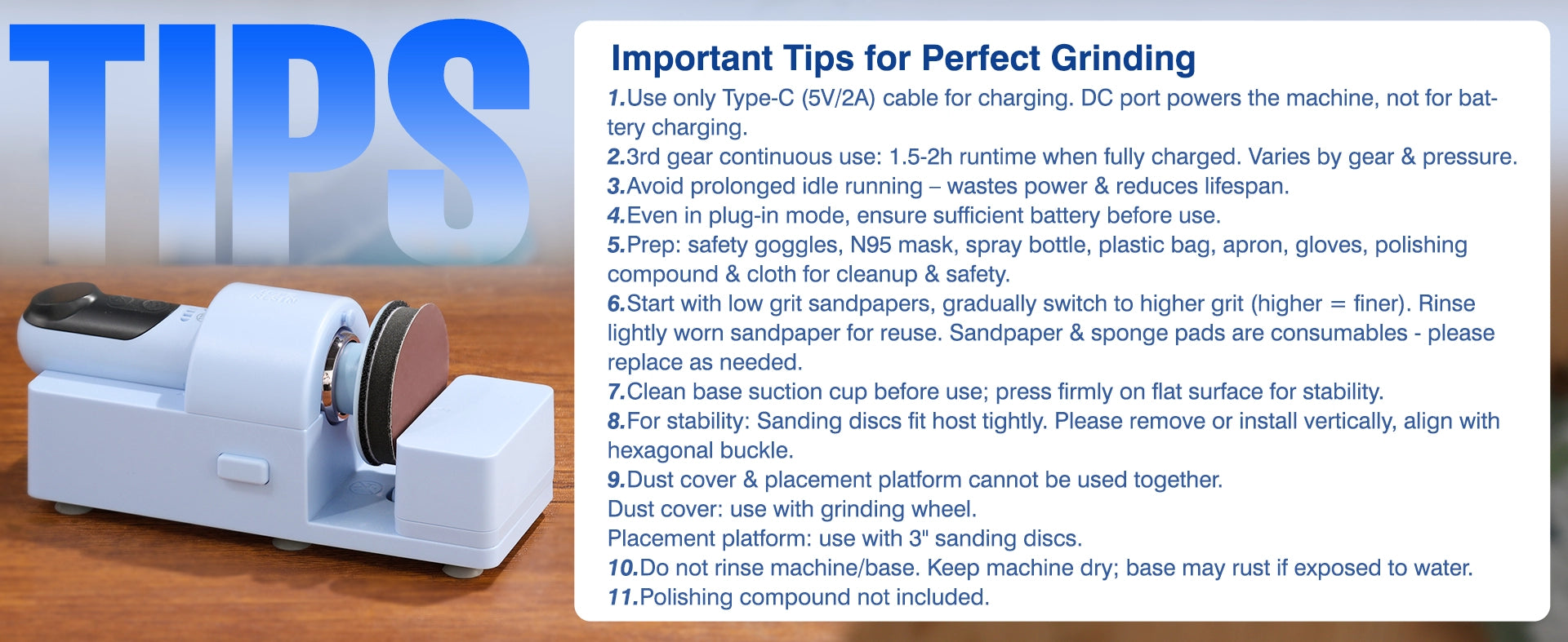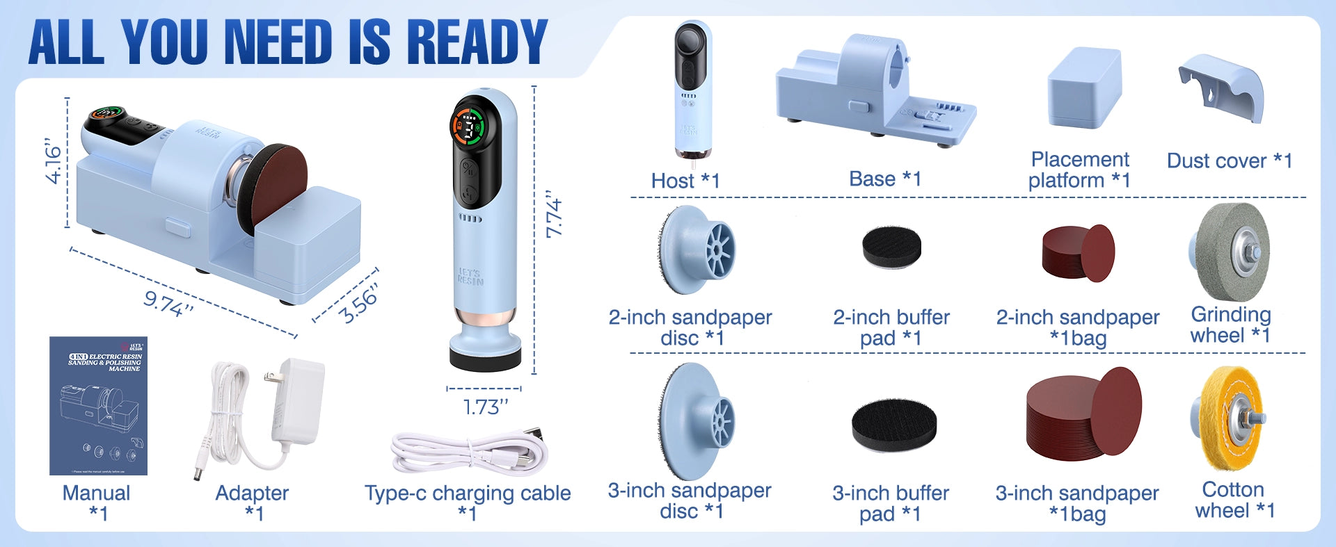 - ALL-IN-ONE KIT: This resin sanding and polishing kit includes: main unit, base, 2" & 3" sanding discs, 3" grinding wheel, 3" cotton wheel, 2" & 3" sandpaper packs (various grits), manual, Type-C cable, and adapter. It has everything for immediate use—perfect for both coarse and fine sanding. Safety features: overheating alarm, overvoltage protection, and 4-minute auto-shutdown, ensuring safe operation.