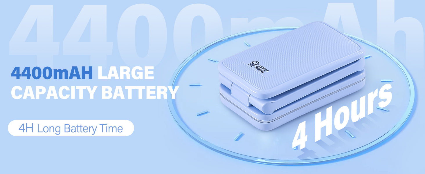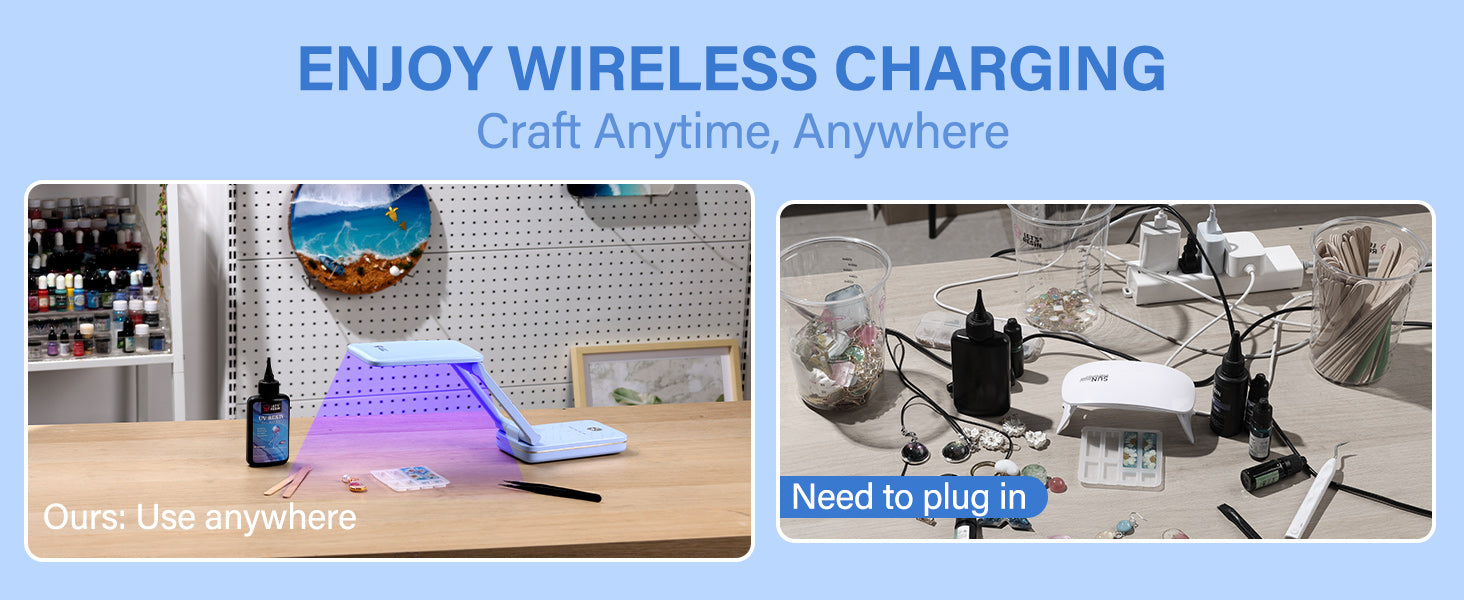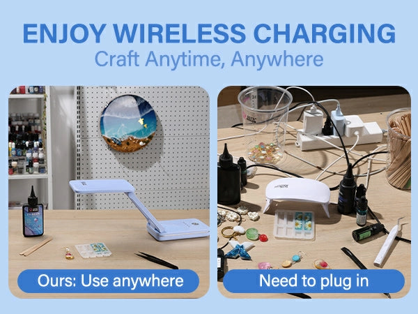 - Wireless and Rechargeable: Say goodbye to the limitations of traditional wired UV lamps. The wireless UV light is equipped with a 4400mAh high-capacity battery, providing up to 4 hours of continuous use on a full charge. Whether you're at home, in the studio, or traveling, it’s easy to use anytime, anywhere, offering perfect curing for your resin projects. No outlet is required—just press the button and enjoy an uninterrupted creative experience.
