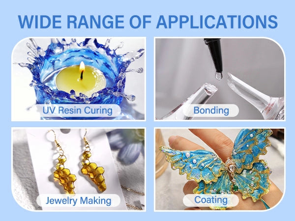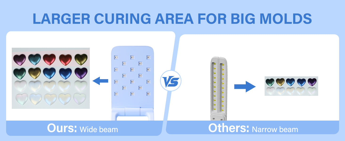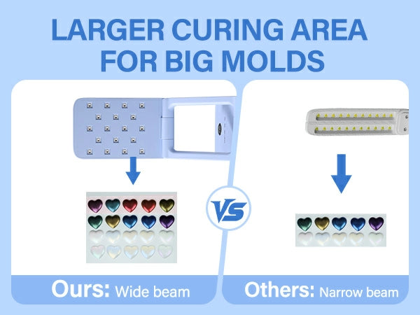 - Wide Coverage, Even Curing: The UV light for resin curing has a wide coverage area of up to 7.0 * 6.2 inches, allowing you to cure multiple UV resin molds at once, greatly enhancing work efficiency. With 18 evenly distributed LEDs, it ensures uniform UV resin lamp coverage, effectively preventing uneven curing and leaving your resin pieces smooth and flat. No need for frequent angle adjustments, ensuring even and fast curing, making your creative process more efficient and convenient.
